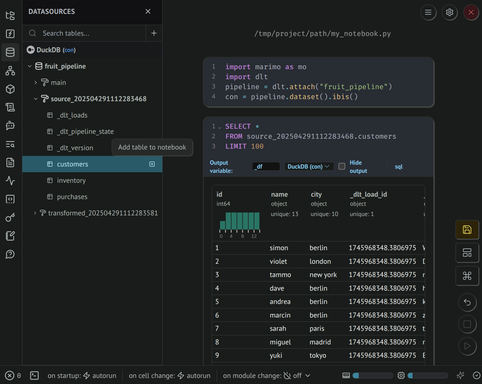 This page shows how dlt + marimo + ibis provide a rich environment to explore loaded data, write data transformations, and create data applications.